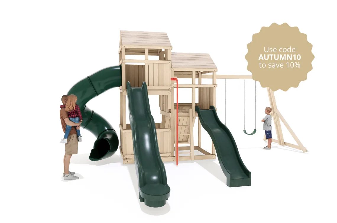 With the standard mountain base and loaded with accessories - including a giant 4.4m super slide and enclosed spiral slide. That's not all; they can climb up the rock wall to their very own fort, slide down the firepole or reach to the sky on their sling swings.