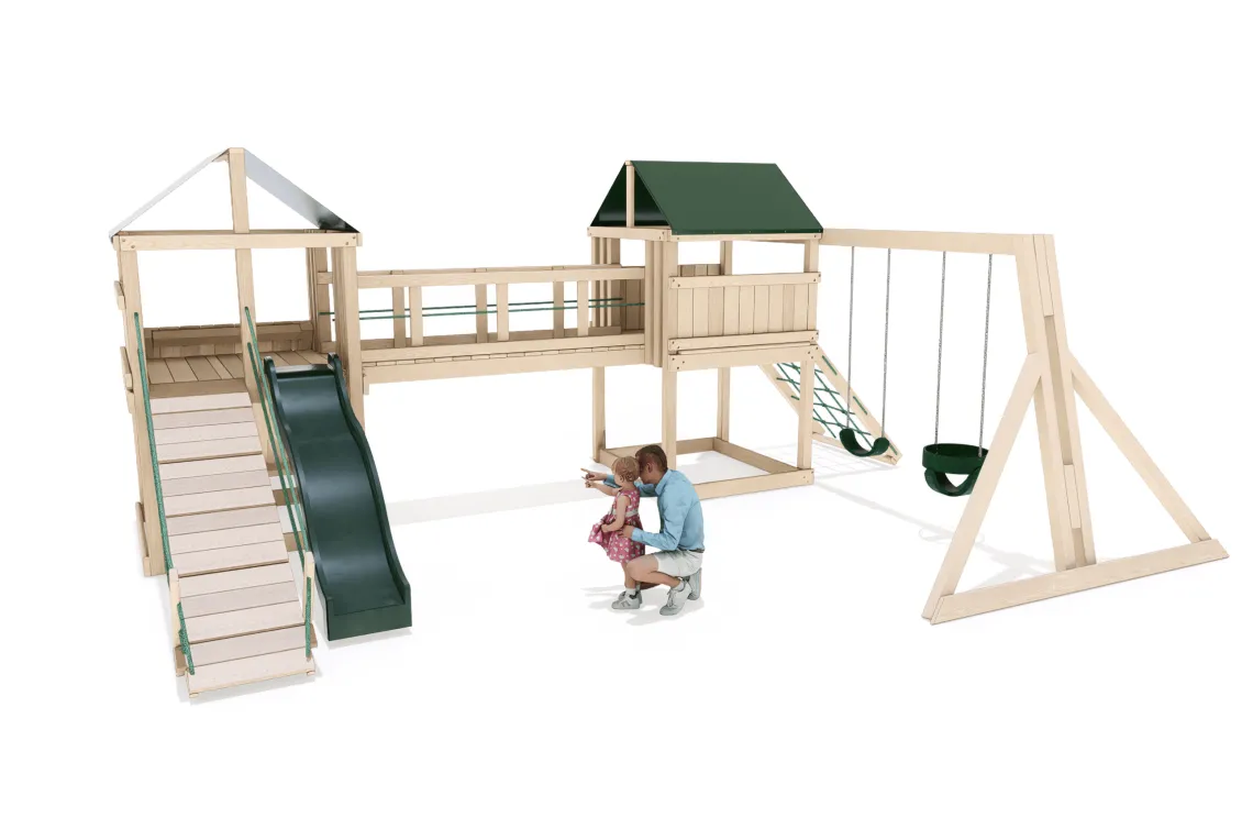 Create a unique playground oasis for your little ones that keeps them engaged and entertained for hours. Standing 6.8m wide and 5.8m deep this Canyon package is designed for medium to larger gardens.