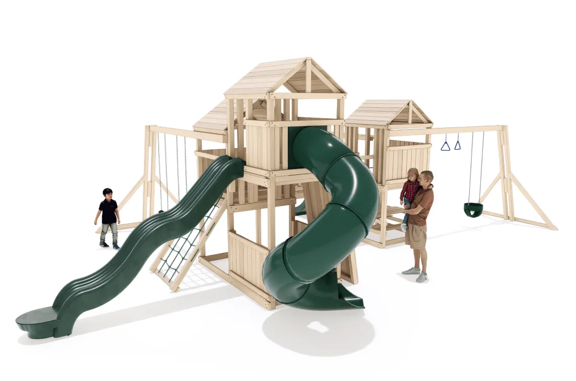 Then, this play package is sure to excite. With three swings and three slides across the play towers, the kids will never feel left without options. But, if thats not enough then the climbing wall, firepole and base fort will surely bring their dreams to life as well.
