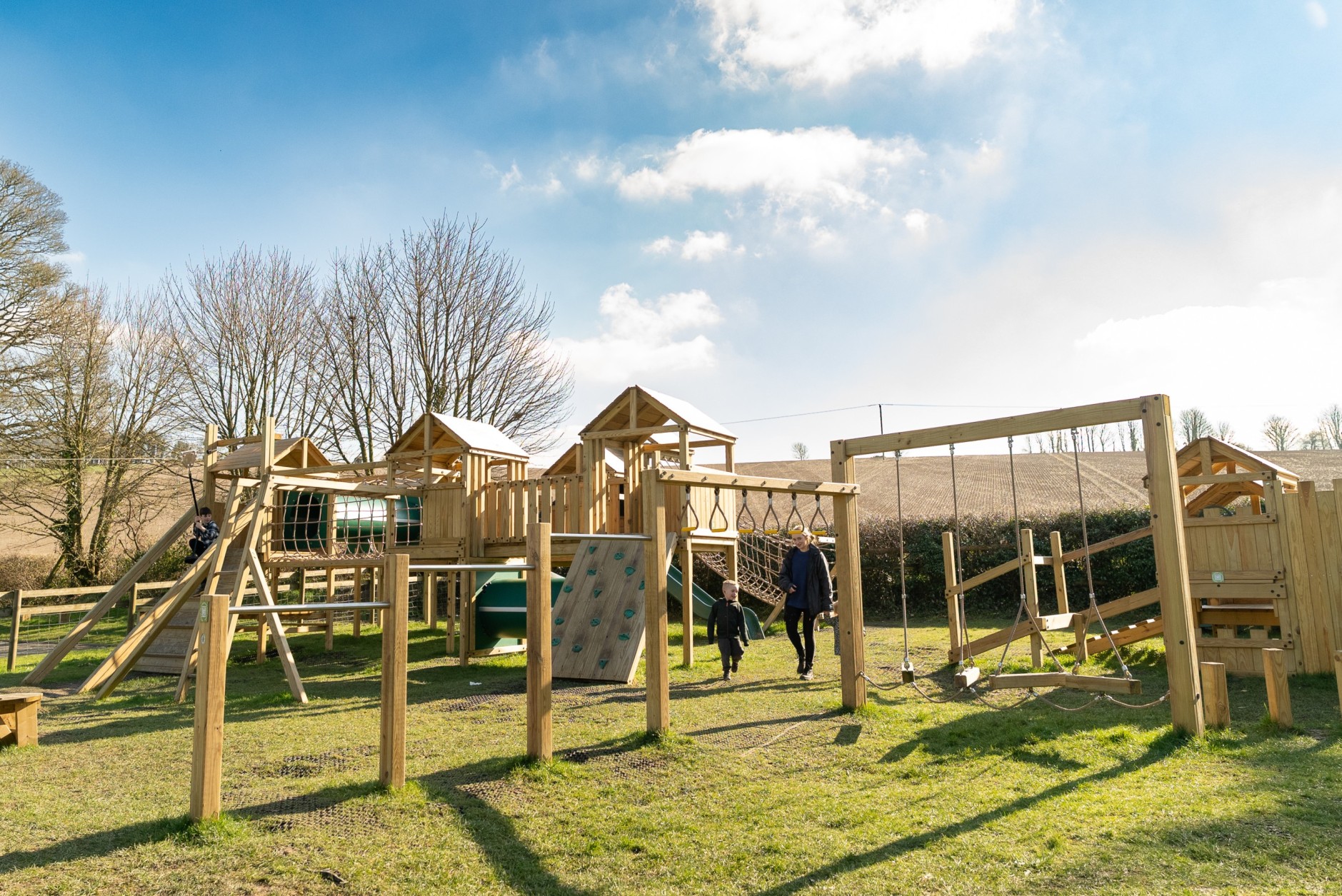 The timber playground at Broad Chalke, Salisbury features towers and accessories from our Multiplay collection, a zip line, swing bay and trampoline.
