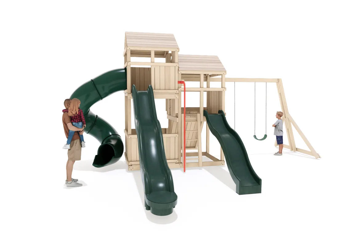 With the standard mountain base and loaded with accessories - including a giant 4.4m super slide and enclosed spiral slide. That's not all; they can climb up the rock wall to their very own fort, slide down the firepole or reach to the sky on their sling swings.
