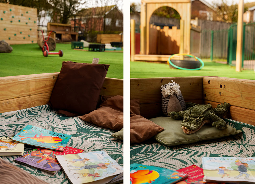 The nursery wanted to make sure that all the play equipment could be used all year round, so the sandpit is also used as a cosy reading nook, filled with blankets, cushions and lots of books.